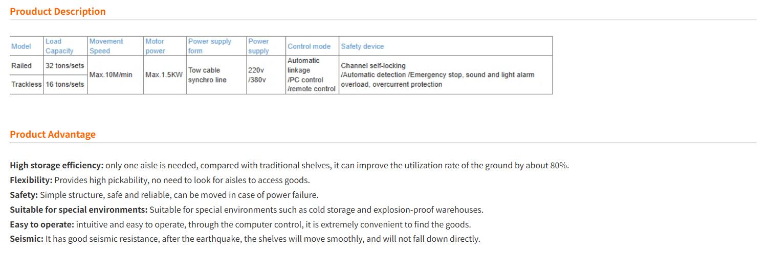 The Electric mobile shelving system, is a professional high-density intelligent warehousing system, is a set of upper computer WMS warehouse management software, imported PLC, inverters, sensors, 7-inch touch screen, Android intelligent mobile terminal collector, RFID, bar code technology system of intelligent storage function as one of the modern warehouse management system, the system only requires a channel, the utilization of space is extremely high.